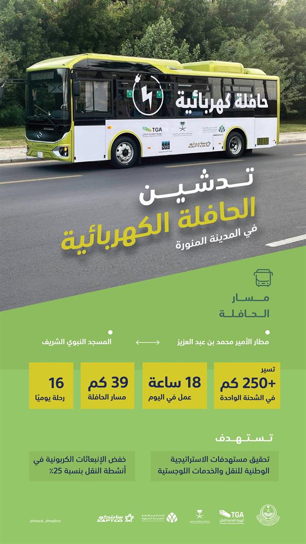 وتتميز الحافلة الكهربائية بالكفاءة التشغيلية العالية التي تمكّنها من السير لمسافة 250 كيلومتراً بالشحنة الواحدة، عبر مسار مخصص يربط مطار الأمير محمد بن عبد العزيز بالمسجد النبوي الشريف ترددياً، بمسافة إجمالية تصل إلى 38 كيلومتراً، وتحتوي من الداخل على نظام تكييف هواء متطور، فضلاً عن شاشات العرض التي توضح تفاصيل الرحلة، إلى جانب تخصيص مجموعة من المقاعد لخدمة الأشخاص ذوي الإعاقة.