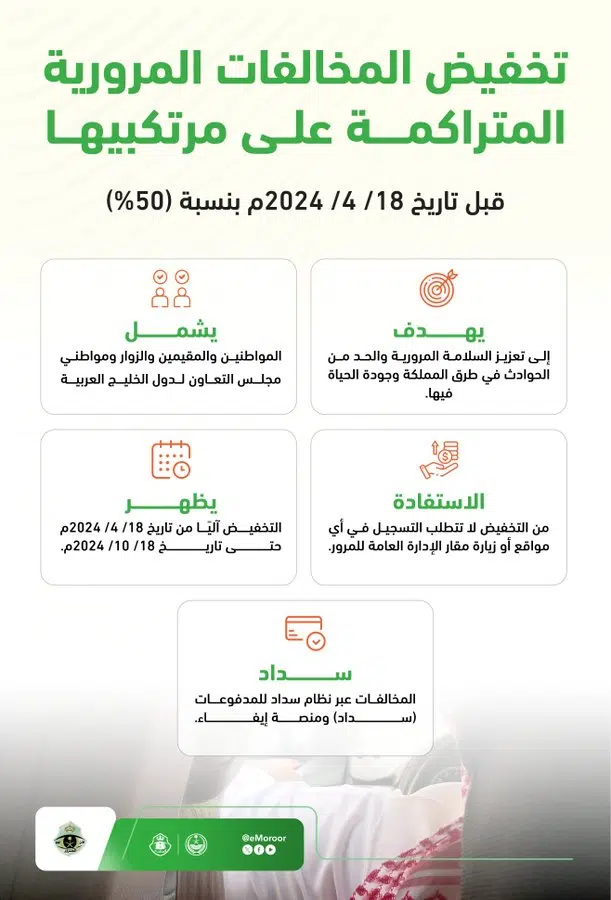 يذكر أنه لكي يتم الاستفادة من التخفيض بإعفاء بنسبة (50%) من قيمة الغرامات، يجب على المخالف المبادرة بسداد جميع مخالفات المرور المتراكمة عليه خلال 6 أشهر تبدأ من تاريخ 18/ 4/ 2024م حتى 18/ 10/ 2024م.