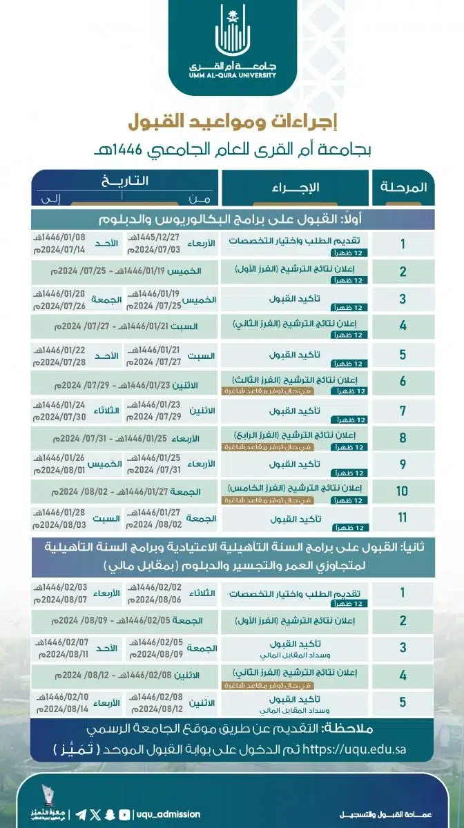 جامعة أم القرى تعلن إجراءات ومواعيد القبول