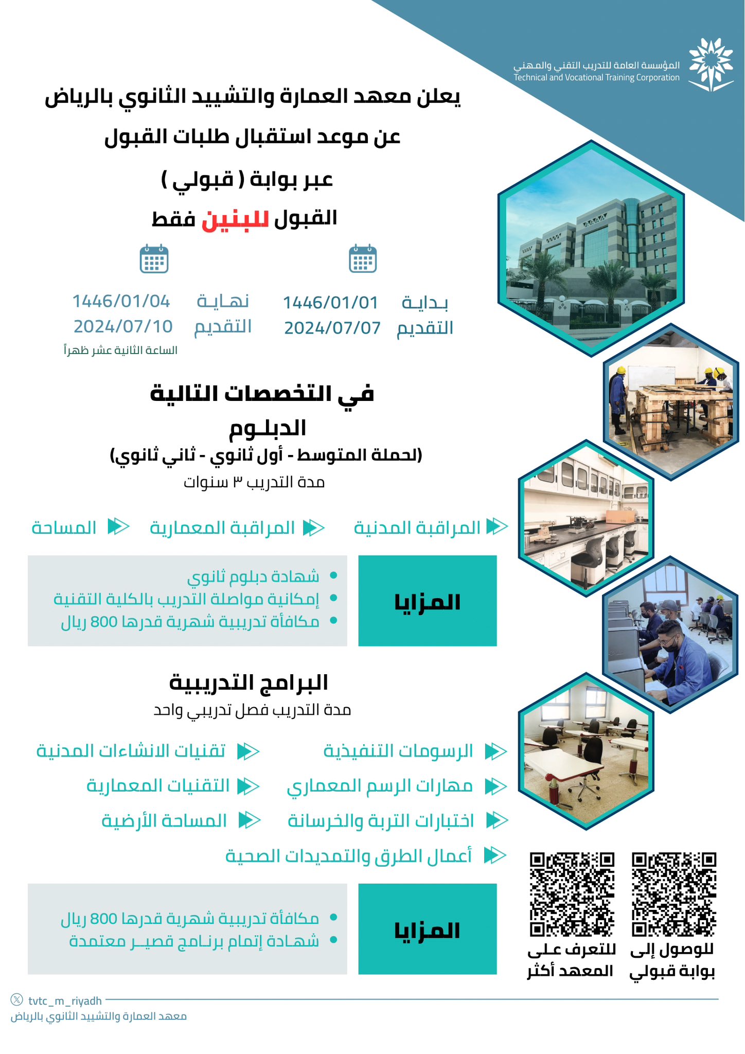 معهد العمارة والتشييد يعلن فتح التسجيل في برامج (لحملة الكفاءة فأعلى)