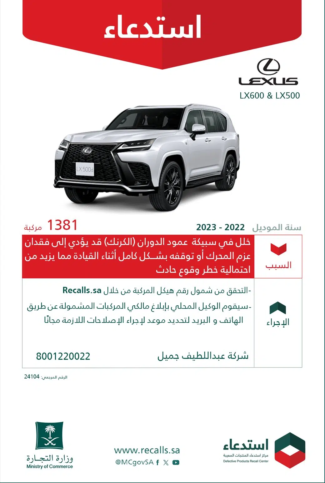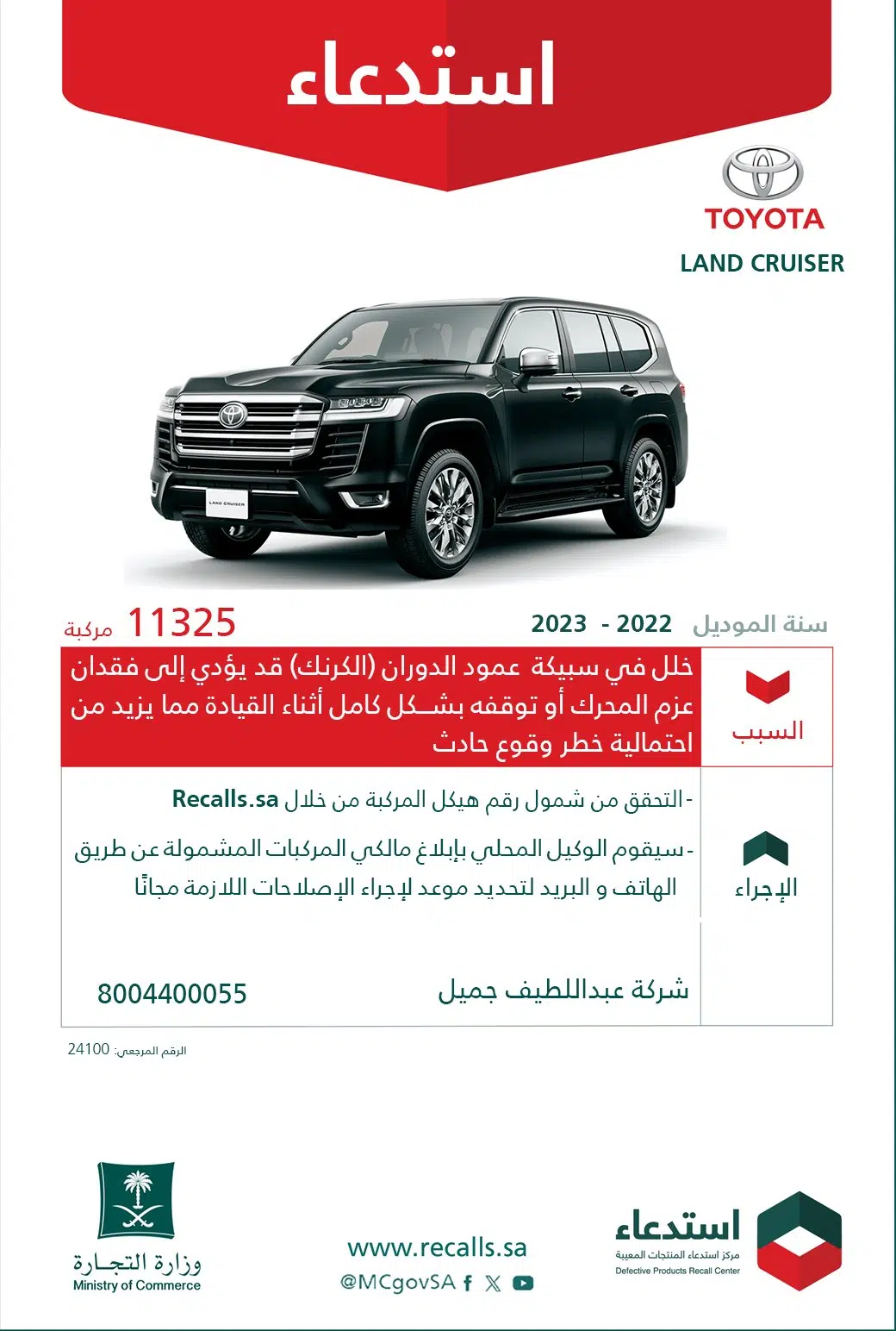 أعلنت وزارة التجارة، اليوم الخميس، استدعاء 12706 مركبات من طراز تويوتا “LAND CRUISER”، ولكزس “LX600 / LX500” لعام 2022 – 2023.