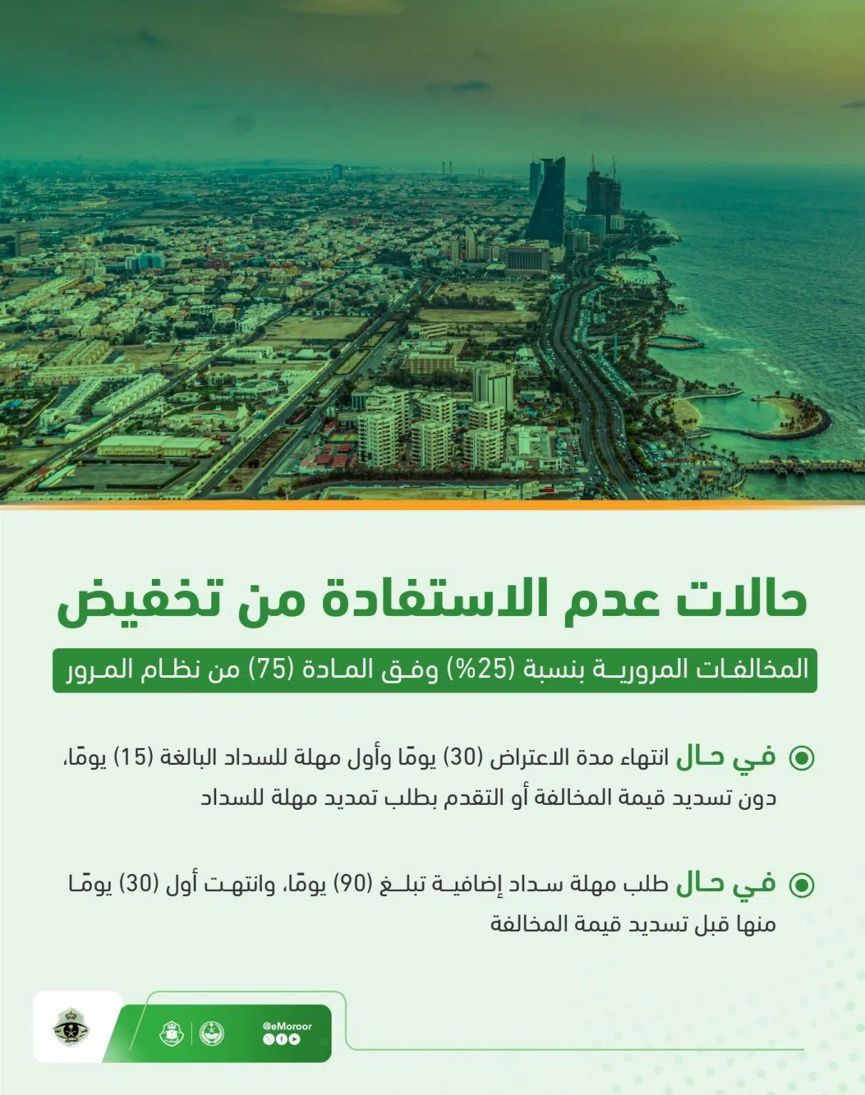 أعاد المرور السعودي، التذكير بحالات عدم الاستفادة من تخفيض المخالفات بنسبة 25% وفق المادة (75) من نظام المرور.
