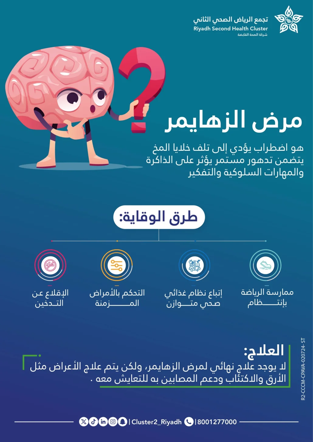 وأوصت مدينة الملك فهد الطبية للوقاية من المرض بالإقلاع عن التدخين، مشيرةً إلى أن الزهايمر يعرف بأنه اضطراب يؤدي إلى تلف خلايا المخ يتضمن تدهورا مستمرا يؤثر على الذاكرة والمهارات السلوكية والتفكير.