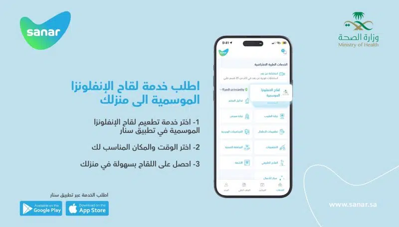 وأكدت وزارة الصحة أنه يمكن أخذ لقاح الإنفلونزا الموسمية في المنزل عبر تطبيق سنار بعدة خطوات بسيطة هي: