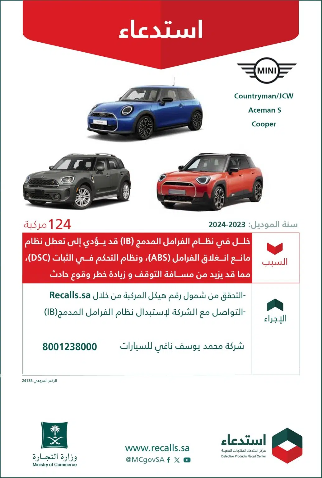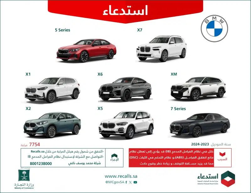 أعلنت وزارة التجارة، اليوم الأربعاء، استدعاء مركبات “عدة طرازات” BMW عدد 7,754 مركبة، MINI عدد 124 مركبة، رولز رويس عدد 60 مركبة، 2023 / 2024.