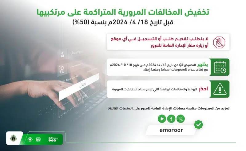 أكد المرور السعودي أنه لا يتطلب تخفيض المخالفات المرورية المتراكمة على مرتكبيها قبل تاريخ 18/ 4/ 2024م بنسبة (50%) التقديم أو التسجيل في أي مواقع أو زيارة مقار الإدارة العامة للمرور.