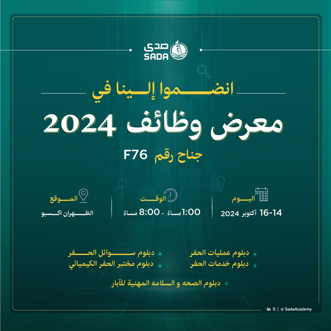 أعلنت أكاديمية الحفر العربية السعودية (صدى) عن تواجدها في (معرض وظائف 2024) في جناح رقم F76، وذلك وفقًا للتفاصيل الموضحة أدناه.