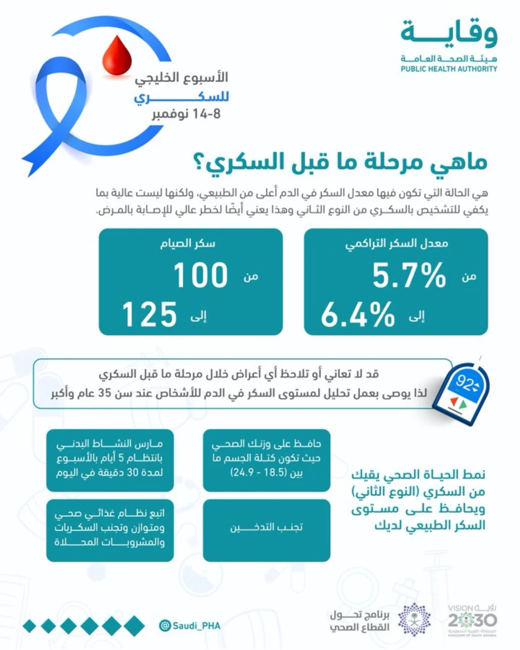 كشفت هيئة الصحة العامة “وقاية”، معطيات مرحلة ما قبل الإصابة بمرض السُّكري، من خلال تحديد معدل السكر التراكمي وسكر الصيام في هذه المرحلة، وذلك تزامناً مع انطلاق الأسبوع الخليجي للسُّكري من 8- 14 نوفمبر الجاري.