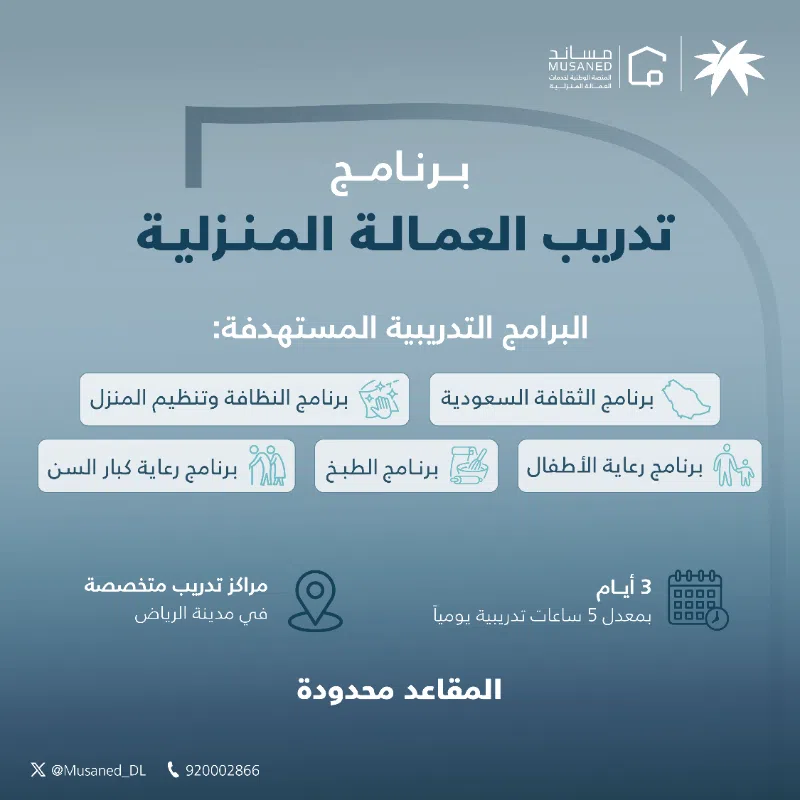 أعلنت منصة مساند المتخصصة في خدمات العمالة المنزلية في المملكة، بالتعاون مع وزارة الموارد البشرية والتنمية الاجتماعية، عن إطلاق برامج تدريبية شاملة (نظرية– عملية) للعمالة المنزلية.