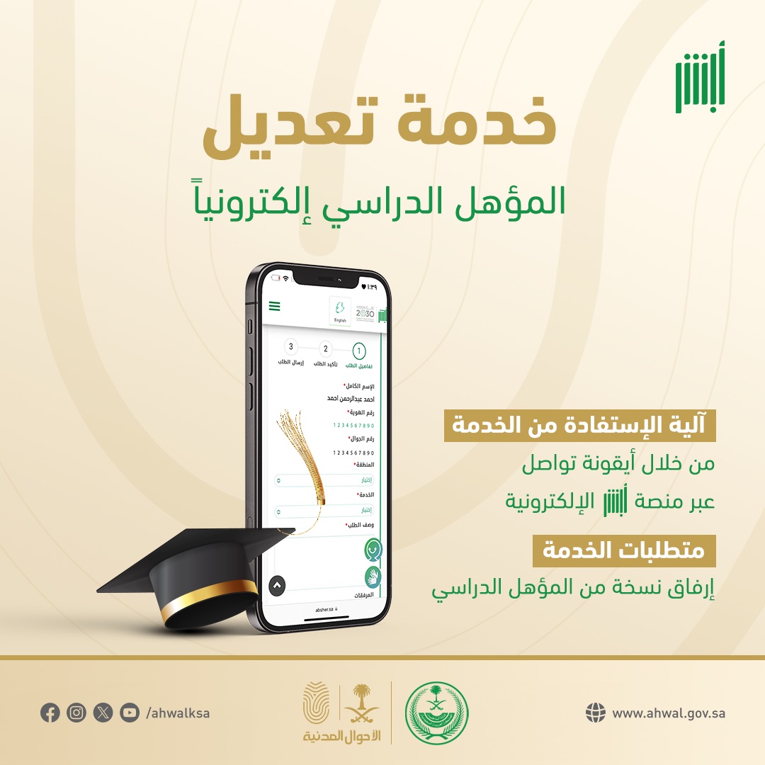 قالت الأحوال المدنية: إنه يتم تغيير المؤهل في بطاقة الهوية الوطنية من خلال مراجعة أقرب مكتب للأحوال المدنية، أو بالإمكان تعديل المؤهل عبر حساب المستفيد في أبشر.