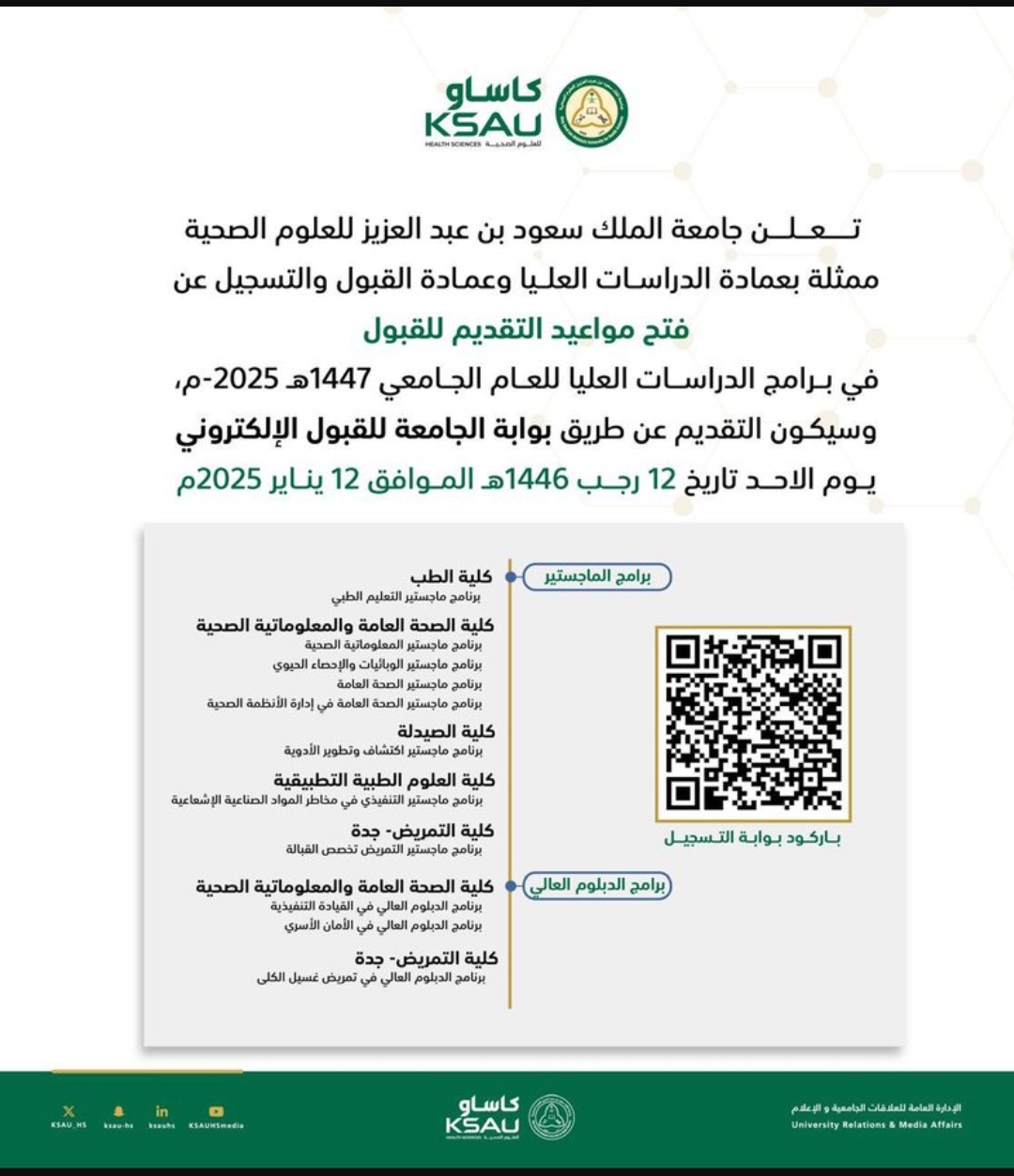 أعلنت جامعة الملك سعود للعلوم الصحية عن مواعيد وشروط التقديم على برامج الماجستير وبرنامجي الدبلوم العالي للعام الجامعي 1447هـ، وذلك وفقًا للتفاصيل الموضحة أدناه.