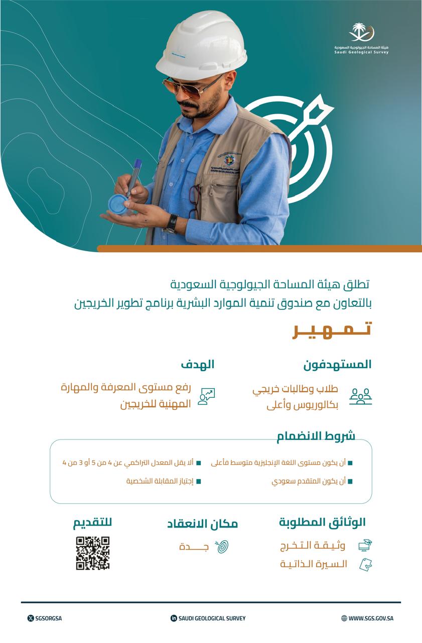 أعلنت هيئة المساحة الجيولوجية السعودية عن إطلاق برنامج تطوير الخريجين (تمهير) بالتعاون مع صندوق تنمية الموارد البشرية (هدف)، وذلك وفقًا للتفاصيل الموضحة أدناه.
