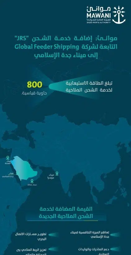 وتعمل خدمة الشحن الجديدة على ربط ميناء جدة الإسلامي بموانئ: موندرا بالهند، والسخنة في مصر، وصلالة في سلطنة عمان، بطاقة استيعابية تبلغ 800 حاوية قياسية.