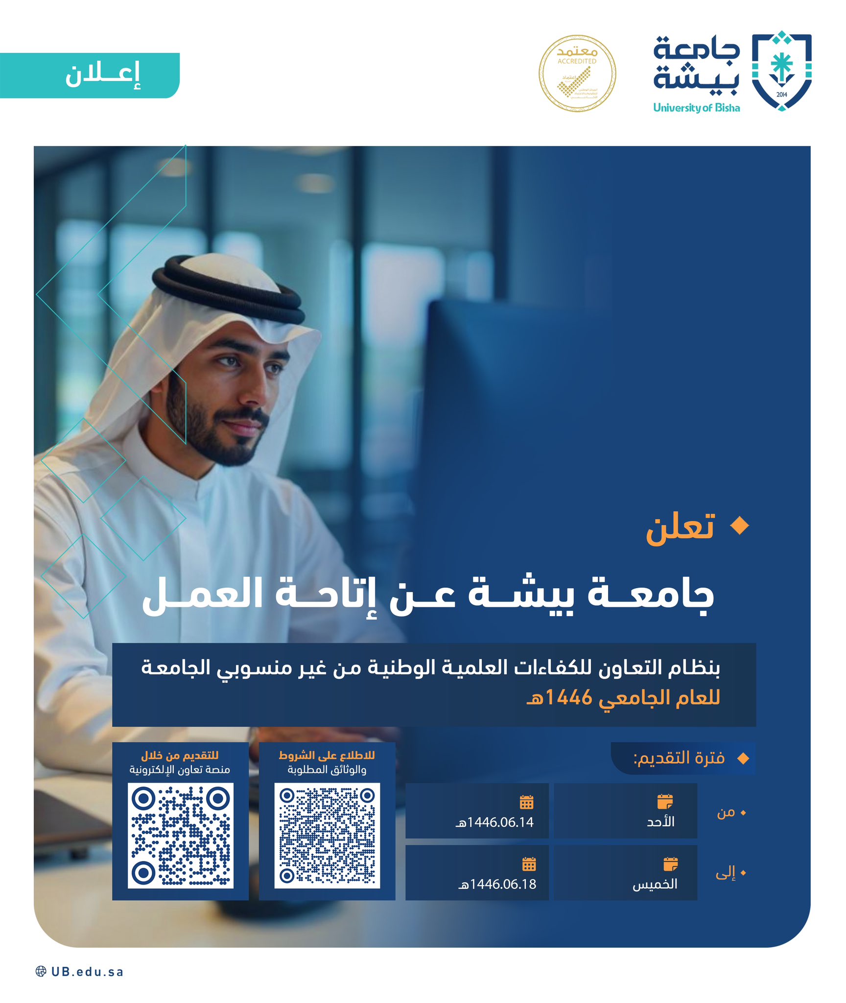أعلنت جامعة بيشة توفر عدد من الوظائف بنظام التعاون من غير منسوبي الجامعة للعام الجامعي 1446هـ في مختلف التخصصات، وذلك وفقًا للتفاصيل وطريقة التقديم الموضحة أدناه.