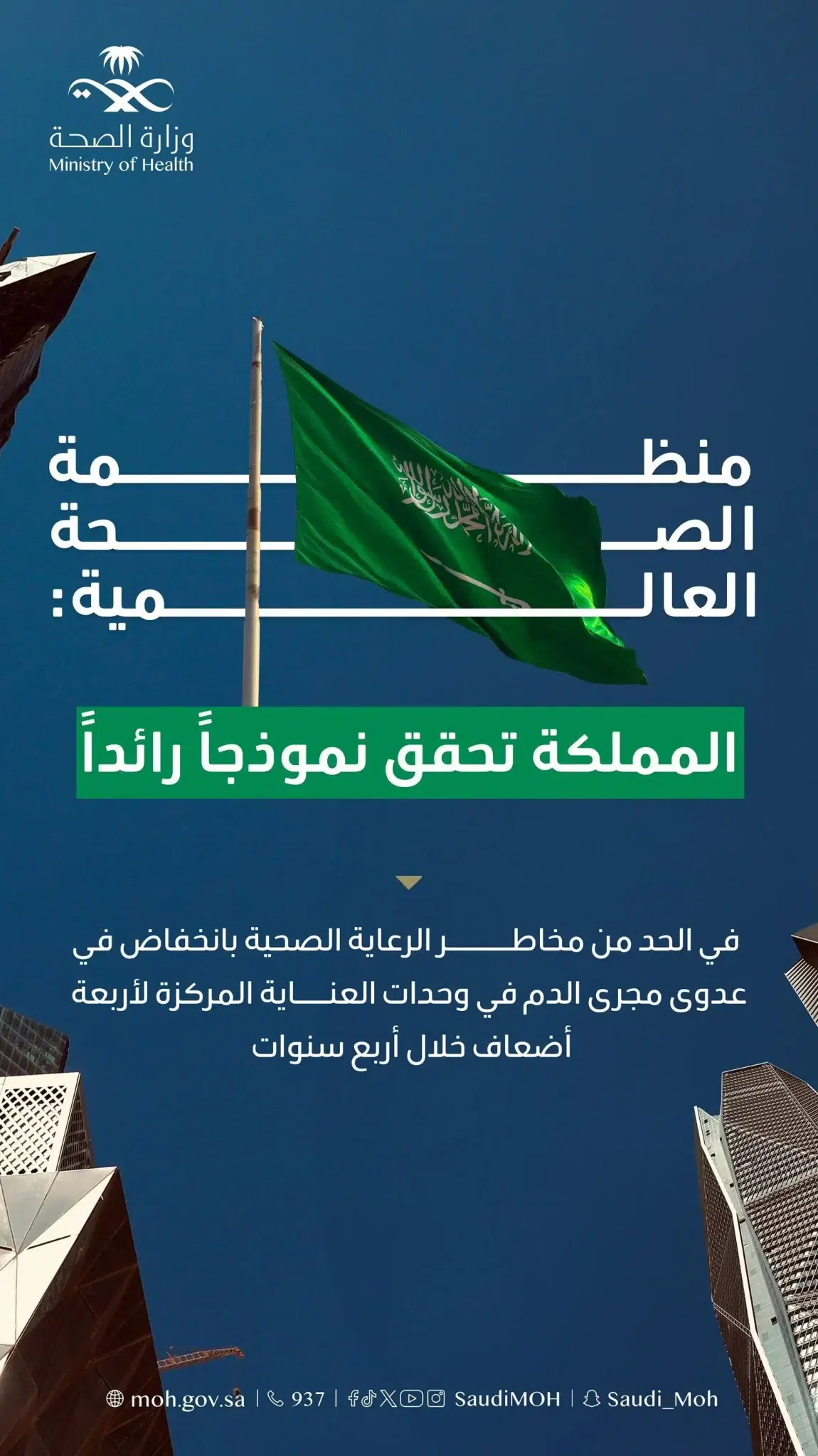 أشادت منظمة الصحة العالمية (WHO) بالتميز الذي تحظى به المملكة في جودة المستشفيات وكفاءتها في مكافحة العدوى، وعدتها أنموذجًا رائدًا يأتي في مقدمة دول العالم في الحد من المخاطر المرتبطة بالرعاية الصحية، وفقًا لتقرير أصدرته المنظمة عبر موقعها الرسمي.