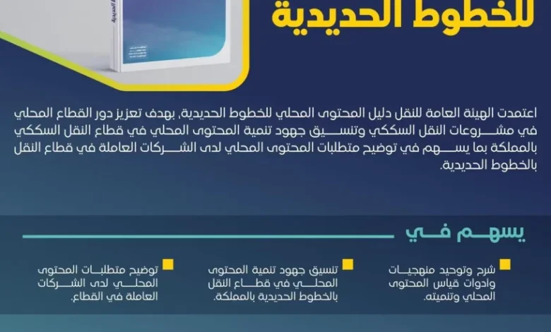 اعتمدت الهيئة العامة للنقل دليل المحتوى المحلي الخاص بالخطوط الحديدية، في إطار جهودها لدعم التنمية الاقتصادية وتعزيز المحتوى المحلي، بما يعكس دورها المحوري كممكن رئيسي لتطوير قطاع النقل بالخطوط الحديدية في المملكة، ويمثل الدليل خطوة إستراتيجية تهدف إلى توحيد منهجيات وأدوات قياس المحتوى المحلي، وتوفير إرشادات واضحة للشركات العاملة في قطاع النقل السككي لضمان الشفافية ورفع نسبة المحتوى المحلي.