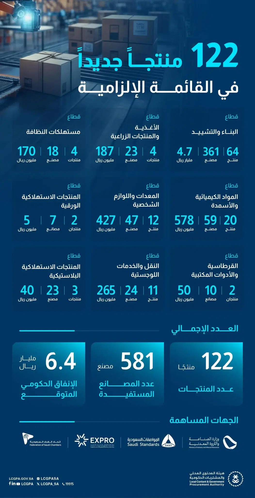 هيئة المحتوى المحلي تُعلن إضافة 122 منتجًا في القائمة الإلزامية
