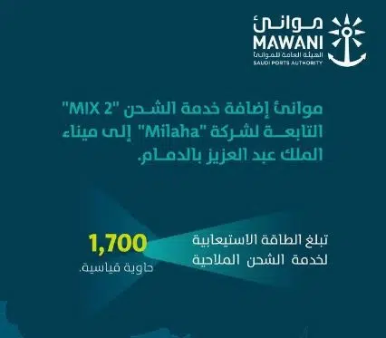 أعلنت الهيئة العامة للموانئ “موانئ” عن إضافة خدمة الشحن الجديدة “MIX 2” التابعة لشركة “Milaha” إلى ميناء الملك عبدالعزيز بالدمام، مما يعزز حركة الصادرات والواردات من و إلى الميناء، وفق رؤية تسهم في رفع كفاءة عملياته التشغيلية.