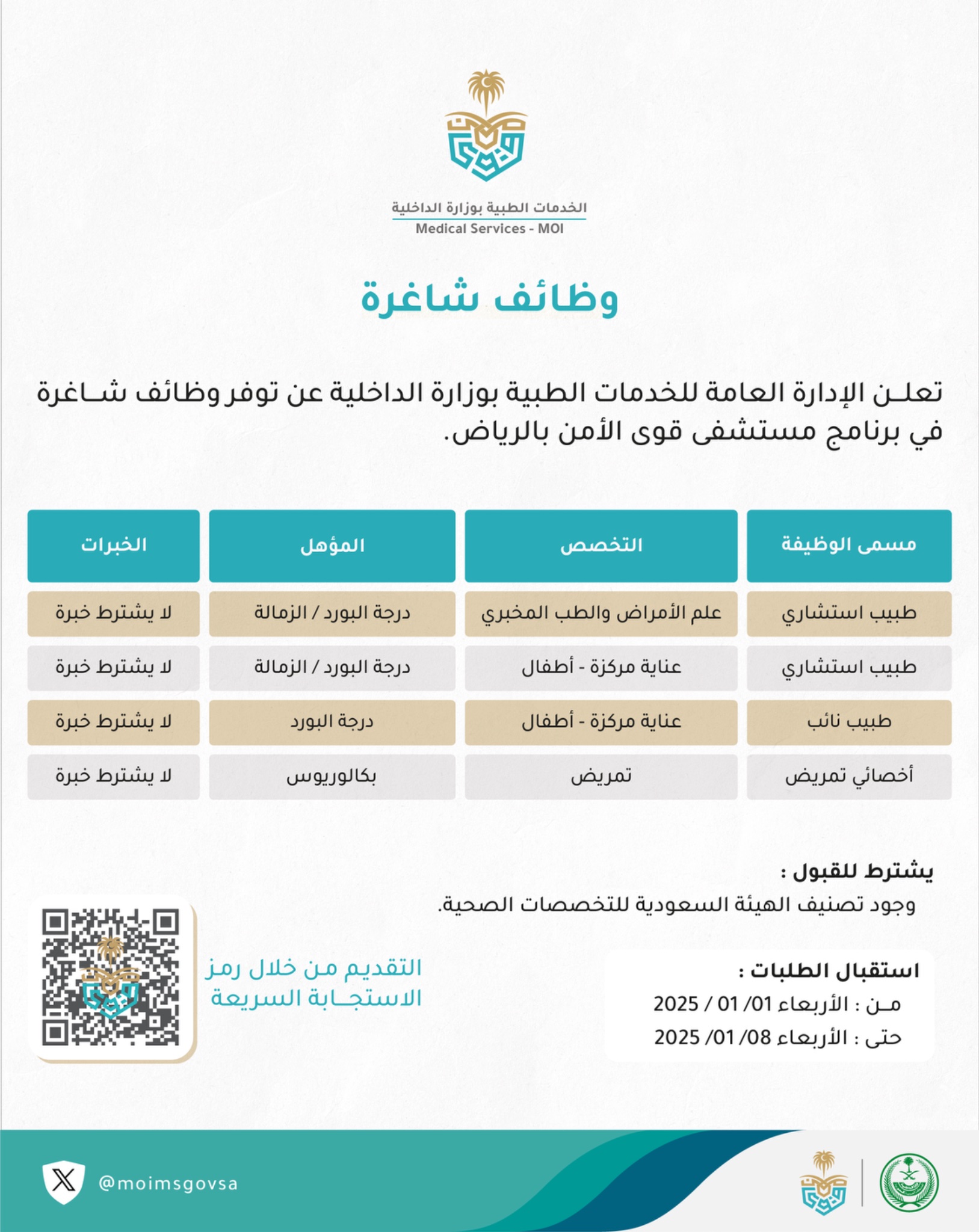 وظائف (الخدمات الطبية بوزارة الداخلية) بالرياض (في المجالات التالية الطبية والتمريضية)