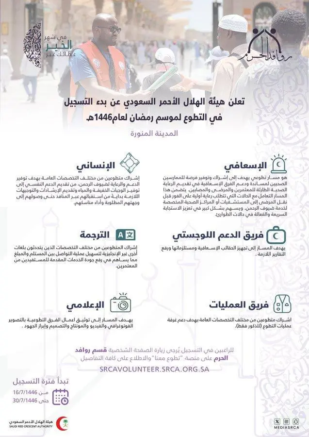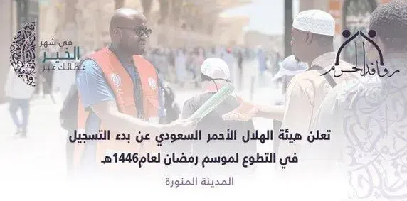 أعلن فرع هيئة الهلال الأحمر السعودي بالمدينة المنورة بدء التسجيل في مسار العمل التطوعي لموسم رمضان المبارك للعام 1446هـ، وذلك لخدمة المصلين والزائرين بالمسجد النبوي الشريف خلال الشهر الفضيل.
