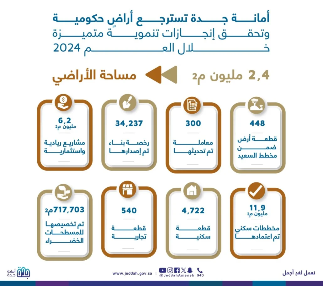 أعلنت أمانة محافظة جدة، في تقرير صادر عن وكالة التعمير، استرجاع أراضٍ حكومية بمساحة إجمالية تجاوزت 2.4 مليون متر مربع خلال العام 2024، إلى جانب تحقيق سلسلة من الإنجازات النوعية في إدارة الأراضي والتنمية الحضرية.