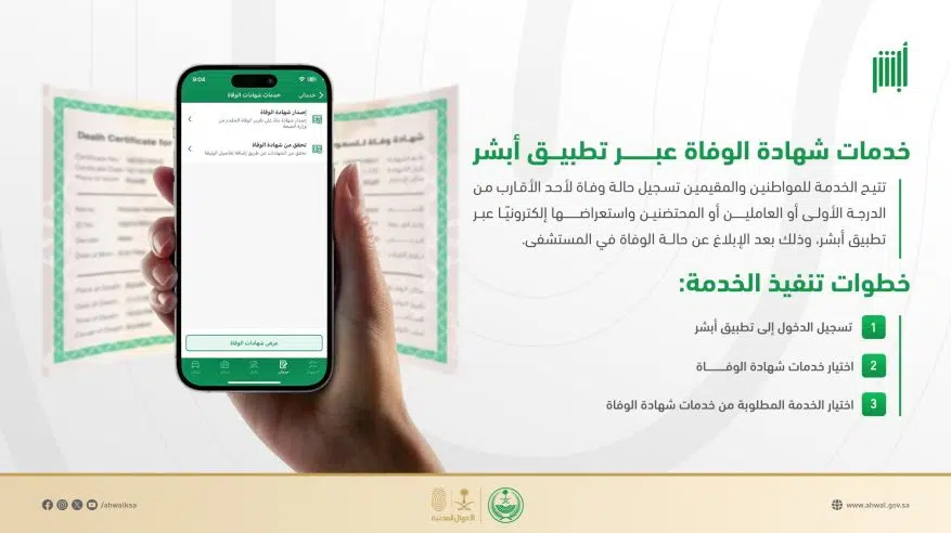 وقالت الأحوال عبر حسابها الرسمي بمنصة إكس: إن خدمات شهادة الوفاة عبر تطبيق أبشر للمواطنين والمقيمين تكون بعد الإبلاغ عن حالة الوفاة في المستشفى.