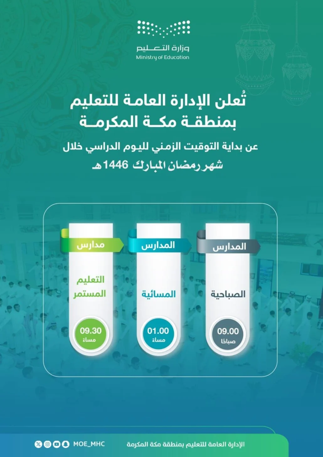 اعتمدت الإدارة العامة للتعليم بمنطقة مكة المكرمة، التوقيت الزمني لبدء اليوم الدراسي لشهر رمضان المبارك لعام 1446 هـ، لمدارس الفترة الصباحية، ومدارس الفترة المسائية، ومدارس التعليم المستمر.