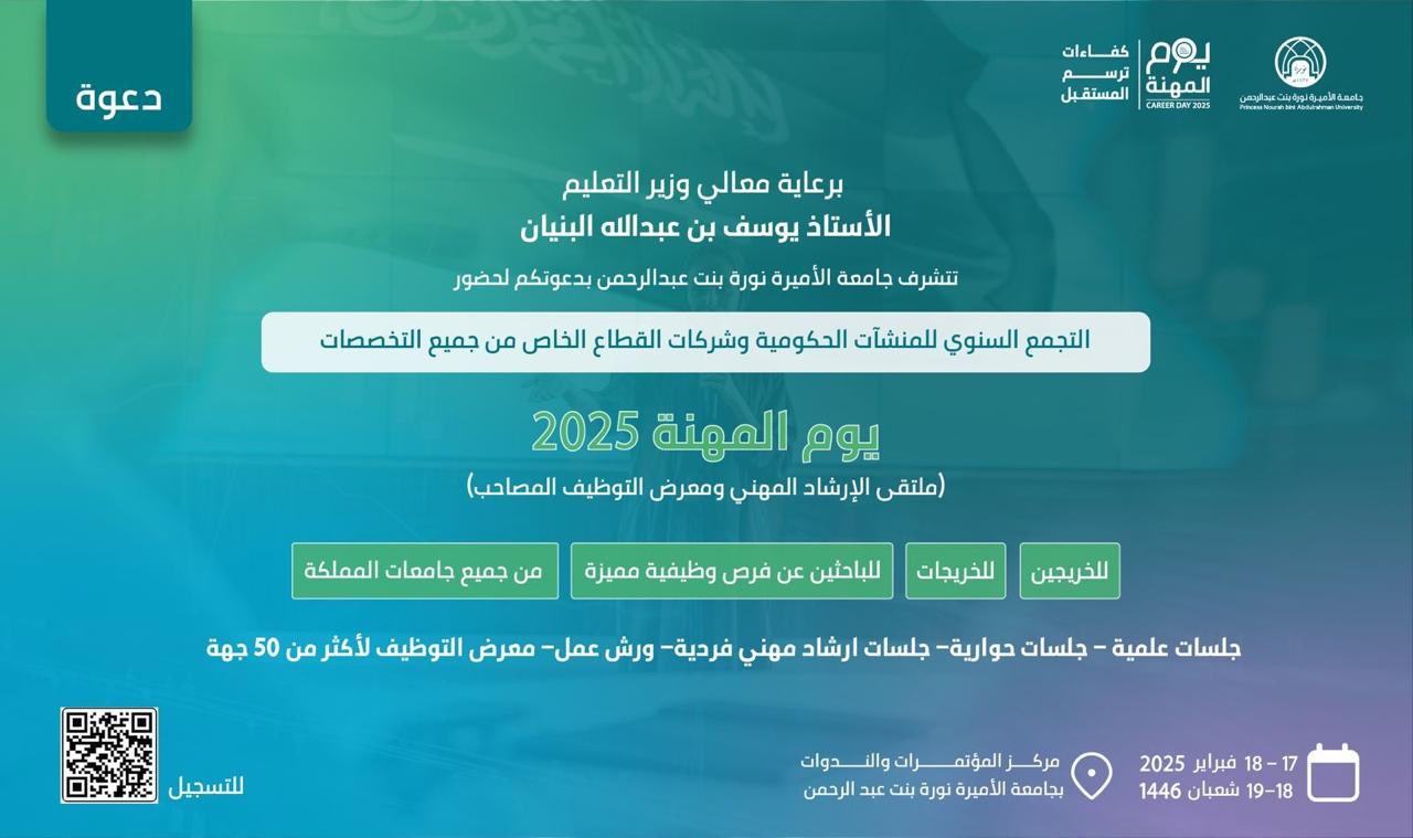 أعلنت جامعة الأميرة نورة بنت عبدالرحمن تنظيم (يوم المهنة 2025) بعنوان (ملتقى الإرشاد المهني ومعرض التوظيف المصاحب) برعاية معالي وزير التعليم، الأستاذ يوسف بن عبدالله البنيان، وذلك وفقاً للتفاصيل الموضحة أدناه.