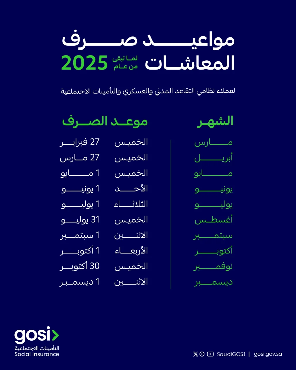 كشفت المؤسسة العامة للتأمينات الاجتماعية (GOSI)، عن مواعيد صرف المعاشات لعملاء أنظمة التقاعد المدني والعسكري والتأمينات الاجتماعية لما تبقى من عام 2025م.