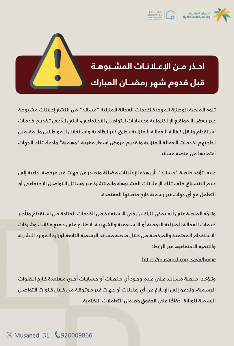 وقالت منصة مساند، في بيان لها عبر منصة إكس: “إن هذه الإعلانات مضللة وتصدر عن جهات غير مرخصة، داعية إلى عدم الانسياق خلف تلك الإعلانات المشبوهة والمنتشرة عبر وسائل التواصل الاجتماعي أو التعامل مع أي جهات غير رسمية خارج منصتها المعتمدة، والالتزام بالمكاتب والشركات المعتمدة لضمان حقوقك، والحذر من الإعلانات المشبوهة قبل قدوم شهر رمضان المبارك”.
