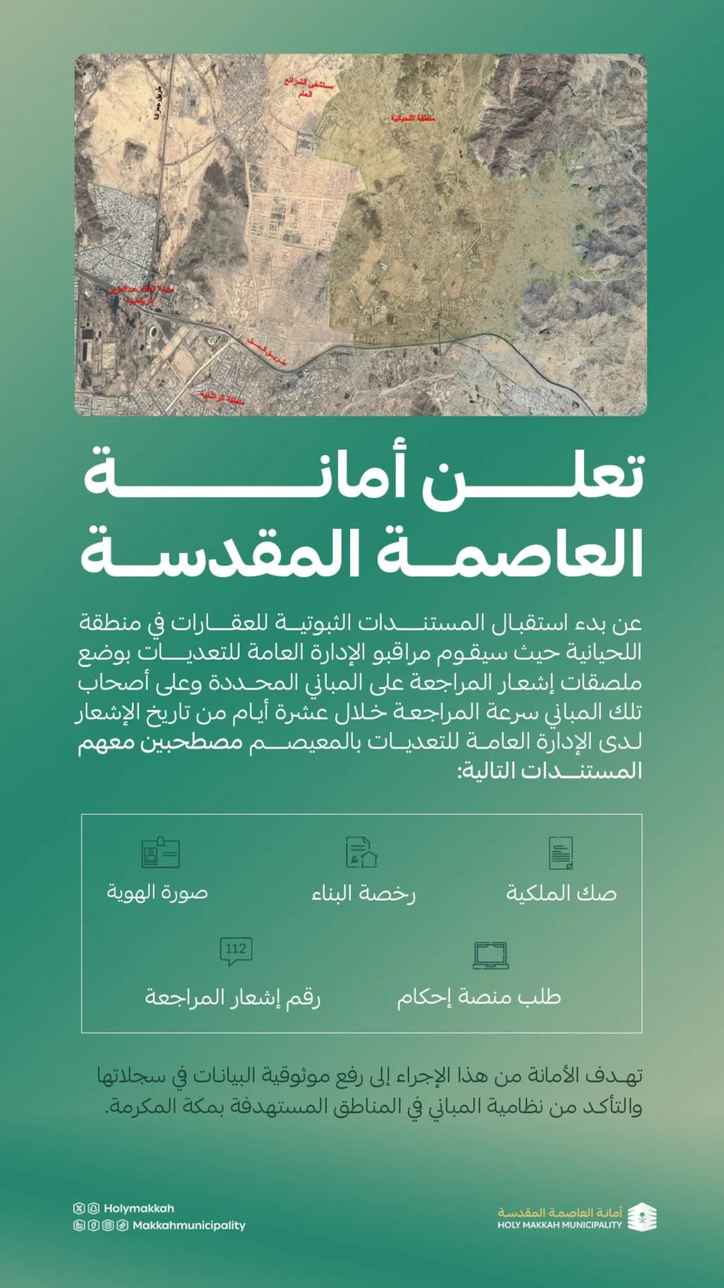 بدأت أمانة العاصمة المقدسة استقبال المستندات الثبوتية للعقارات في منطقة اللحيانية، حيث سيقوم مراقبو الإدارة العامة للتعديات بوضع ملصقات إشعار المراجعة على المباني المحددة.