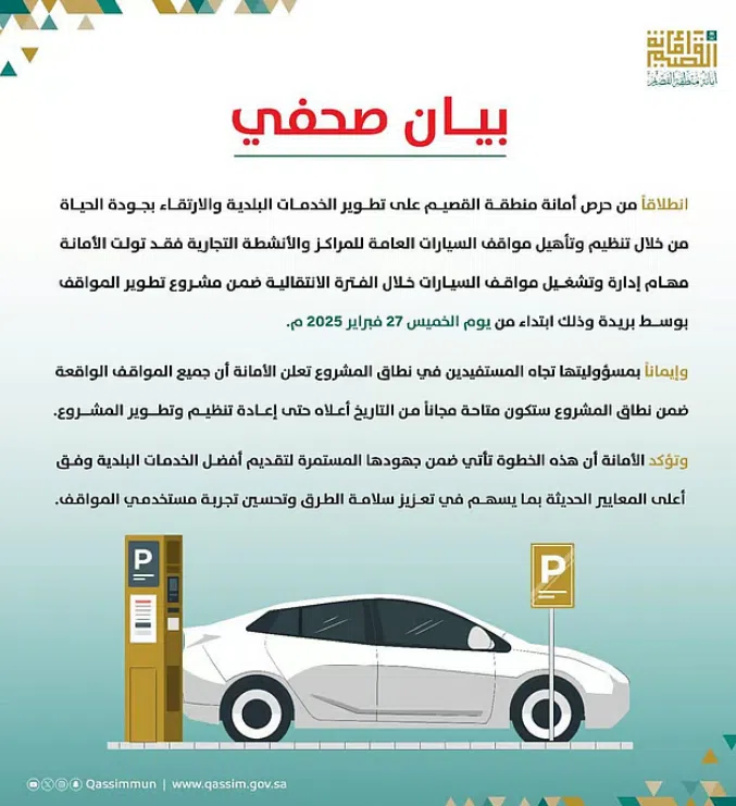 أمانة القصيم تبدأ تشغيل مواقف السيارات بدءًا من الغد