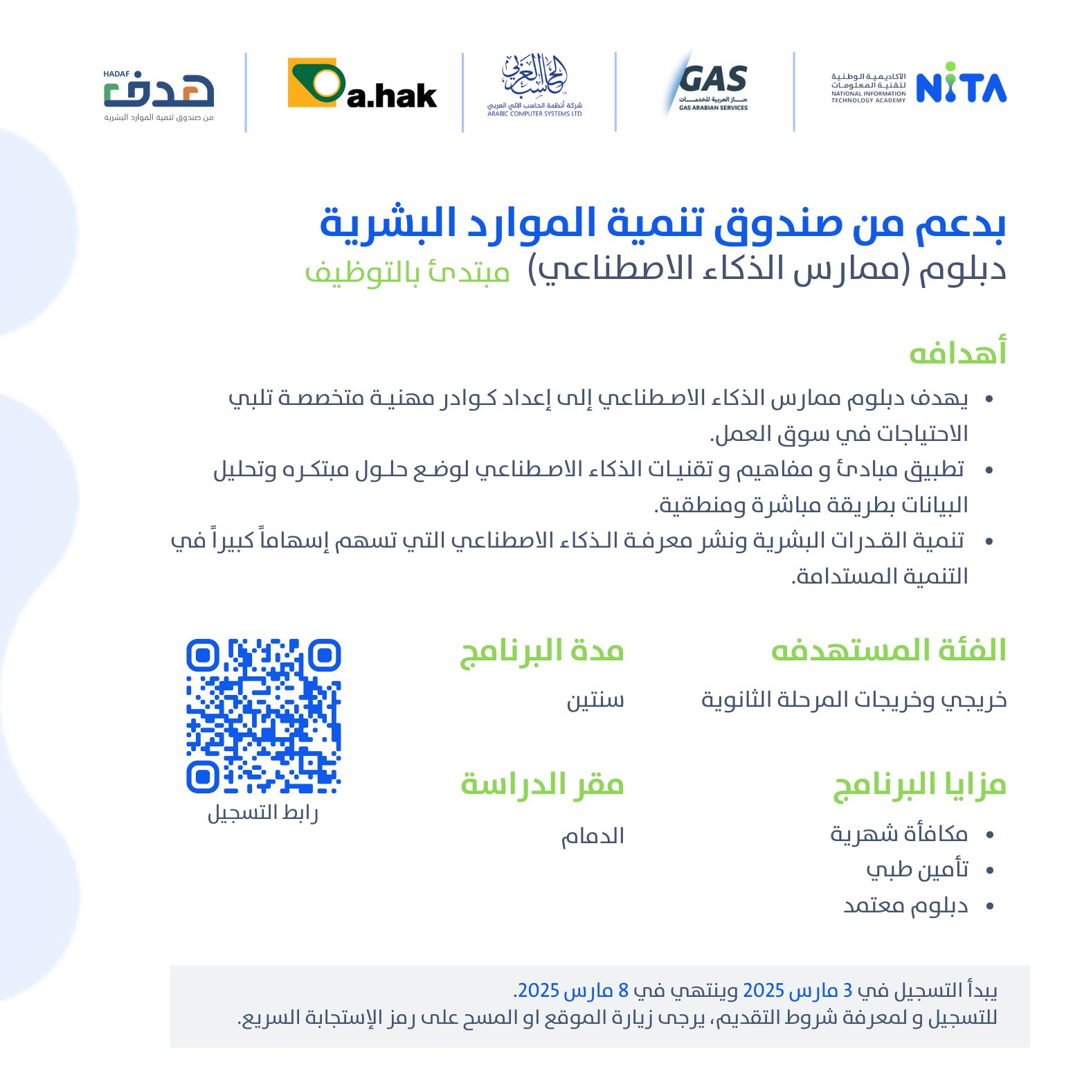 أعلنت الأكاديمية الوطنية لتقنية المعلومات (بدعم من صندوق تنمية الموارد البشرية) عن بدء التسجيل (رجال / نساء) في برنامج (دبلوم ممارس الذكاء الاصطناعي) المبتدئ بالتوظيف، وذلك وفقاً للتفاصيل وطريقة التقديم الموضحة أدناه.