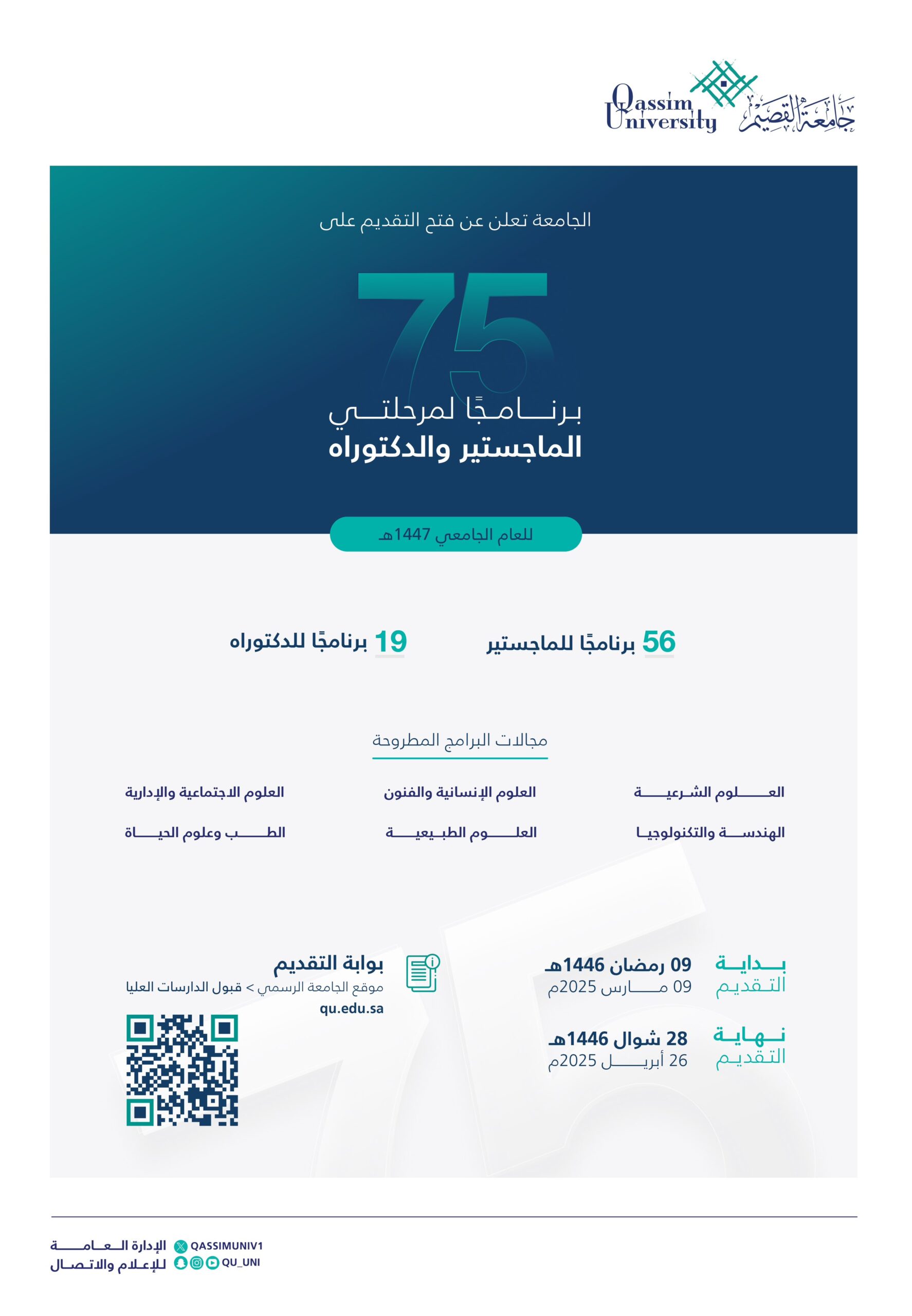 جامعة القصيم (٧٥ برنامج دراسات عليا) للعام الجامعي ١٤٤٧هـ