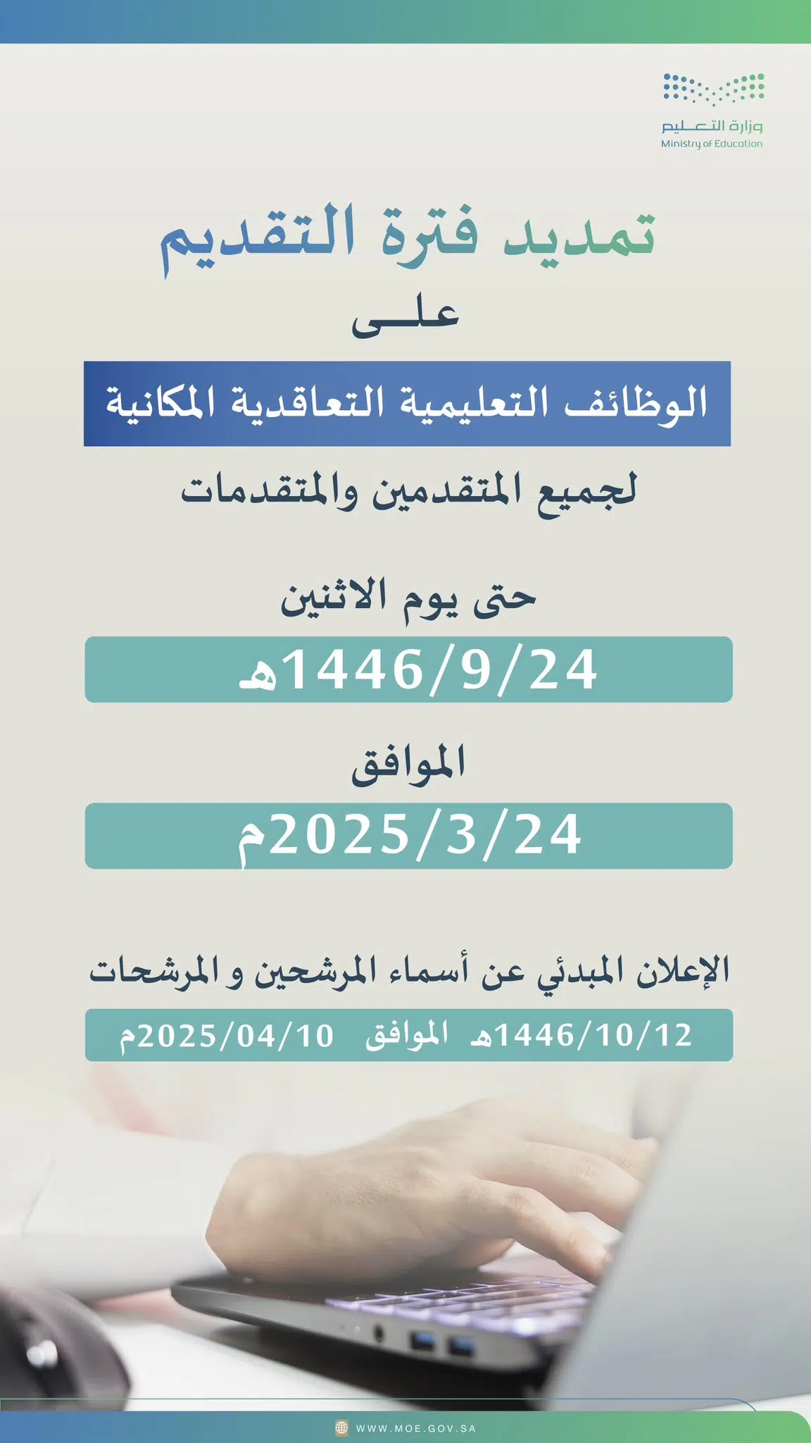 تمديد فترة التقديم على الوظائف التعليمية التعاقدية المكانية