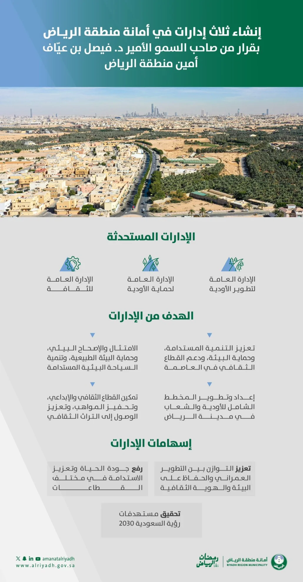 أصدر أمين منطقة الرياض، الأمير د. فيصل بن عيّاف، قرارًا بإنشاء 3 إدارات تتضمن الإدارة العامة لحماية الأودية والإدارة العامة لتطوير الأودية والإدارة العامة للثقافة، وذلك بهدف حماية البيئة الطبيعية، وتمكين القطاع الثقافي والإبداعي.