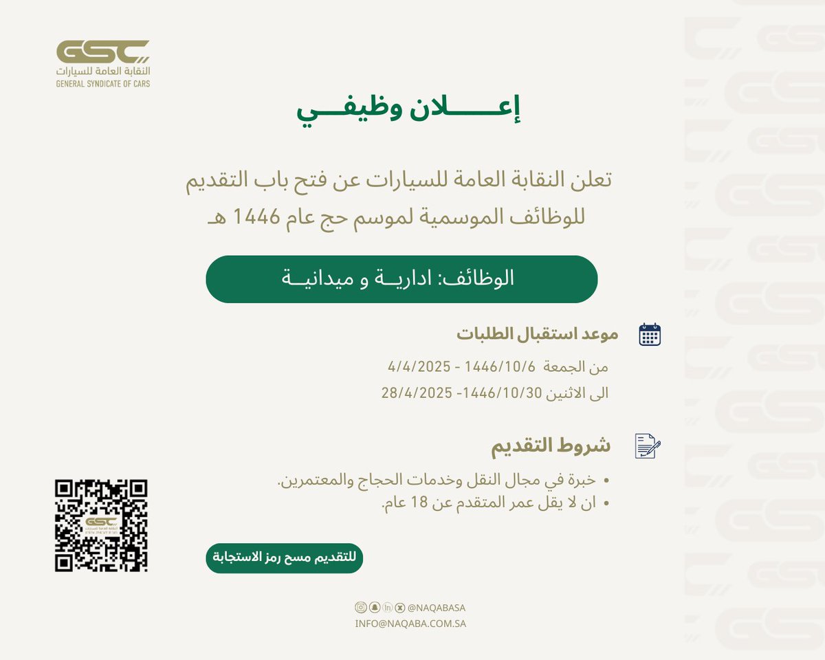 النقابة العامة للسيارات تعلن وظائف موسمية لحج ١٤٤٦هـ (إدارية وميدانية) لكافة المؤهلات