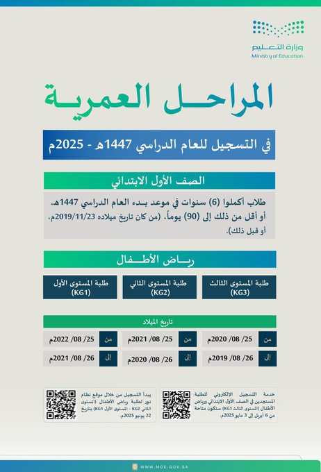 إعلان التفاصيل الكاملة لتسجيل الطلبة المستجدين في الصف #الأول_الابتدائي و #رياض_الأطفال للعام الدراسي 1447ﮪ/2025م: