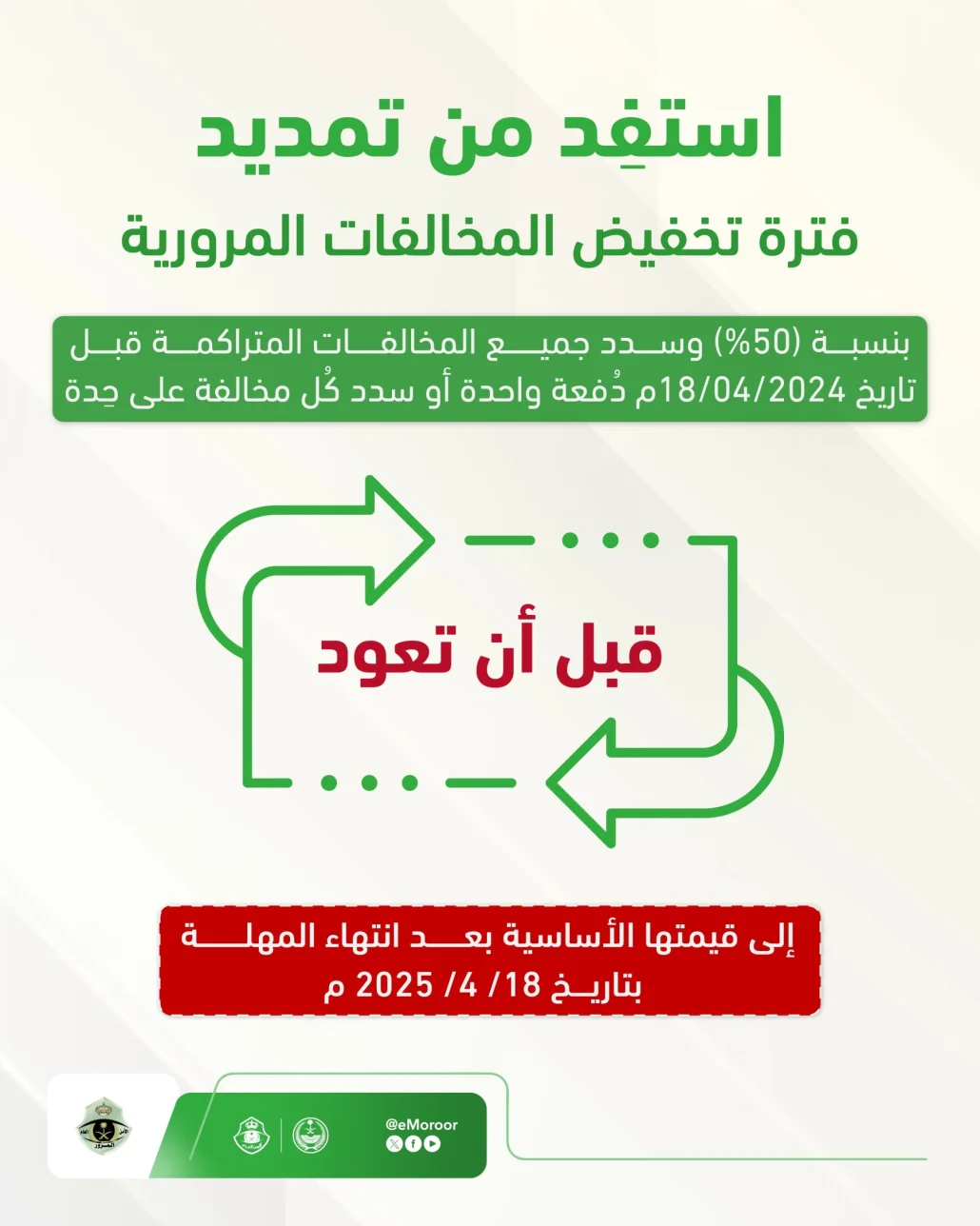 ودعا المرور للاستفادة من فترة تخفيض المخالفات المرورية المتراكمة قبل تاريخ 18 أبريل 2024 بنسبة 50%، والسداد قبل نهاية يوم 18 أبريل الجاري، حيث ستعود المخالفات إلى قيمتها الأساسية بعد ذلك التاريخ.