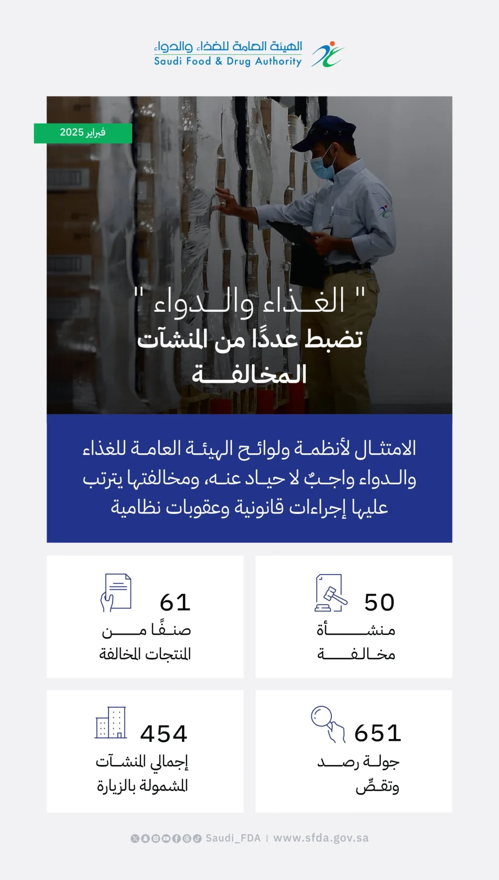 أسفرت الجولات التفتيشية التي نفّذتها الهيئة العامة للغذاء والدواء خلال شهر فبراير 2025م، عن ضبط 50 منشأة مخالفة و61 صنفًا من المنتجات غير المطابقة للوائح التنظيمية، وذلك ضمن التزامها المستمر بضمان سلامة المنتجات الغذائية والدوائية، والتأكد من امتثالها للمعايير المعتمَدة.