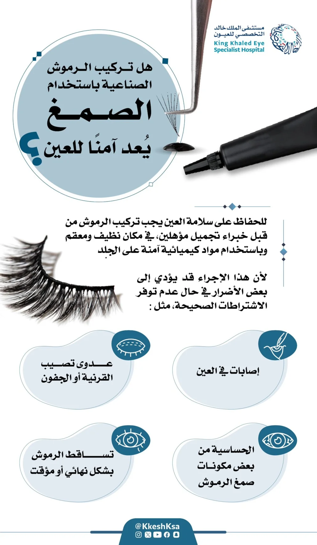 وأوضحت مستشفى الملك خالد التخصصي للعيون، أن تركيب وإزالة الرموش الصناعية عملية دقيقة تتطلب دقة عالية، فأي حركة غير مدروسة قد تسبب إصابة مباشرة للعين، سواء من الأدوات الحادة أو جزيئات الصمغ اللاصق، ما يسفر عن التهابات خطيرة أو مشاكل بصرية تحتاج إلى رعاية طبية فورية.