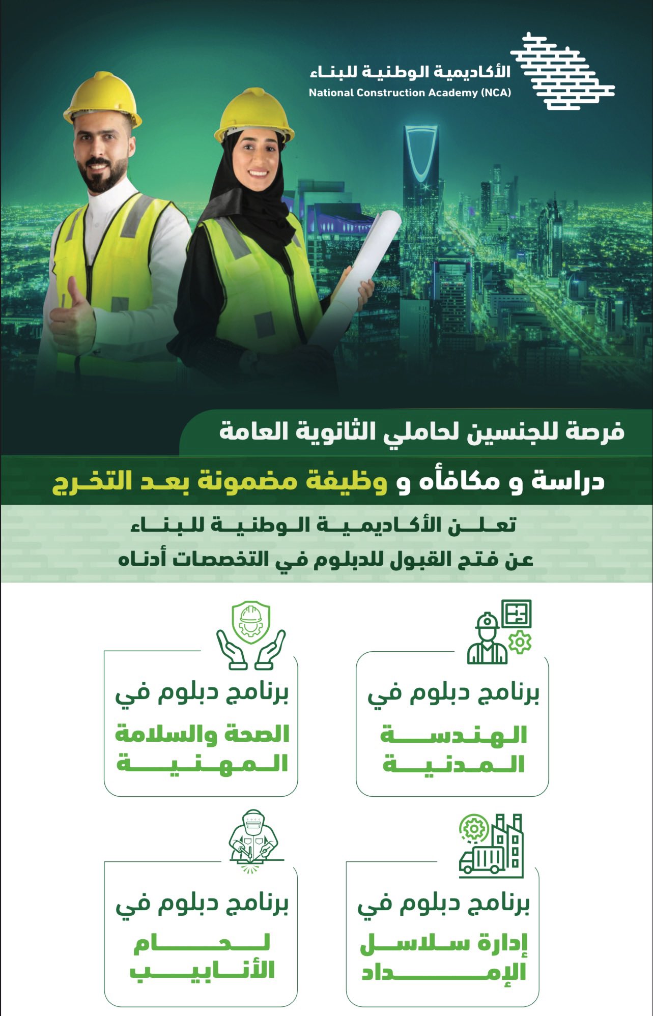 الأكاديمية الوطنية للبناء(يتم تدريبك بمكافأة شهرية 2,000 ريال وبعد التخرج راتب 7,000 ريال) لحملة الثانوية