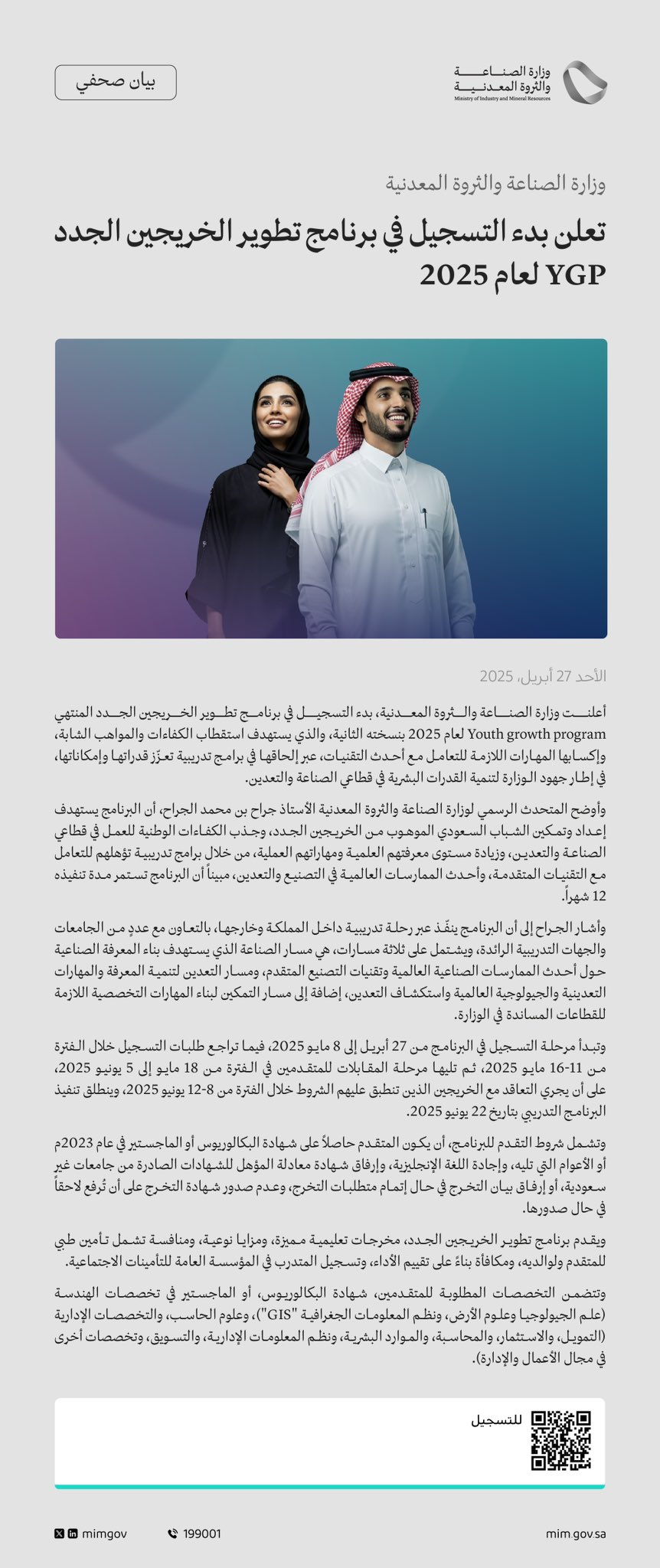 أعلنت وزارة الصناعة والثروة المعدنية عن بدء التسجيل في برنامج تطوير الخريجين الجدد (Youth Growth Program – YGP) لعام 2025م، وهو برنامج تدريبي نوعي يستهدف نخبة الخريجين الجدد لتأهيلهم لسوق العمل السعودي والمنافسات العالمية، وذلك وفقاً للتفاصيل الموضحة أدناه.