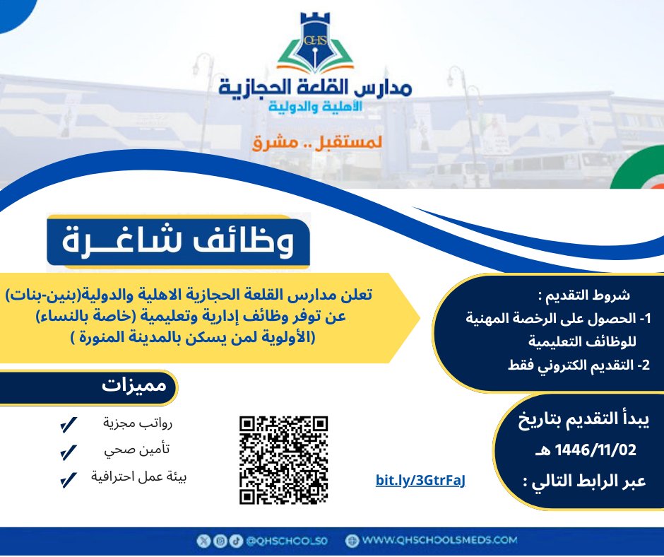 أعلنت مدارس القلعة الحجازية الأهلية والدولية بالمدينة المنورة عن فتح باب التوظيف للكوادر النسائية في المجالات التعليمية والإدارية للعام الدراسي 1447هـ، وذلك وفقاً للتفاصيل وطريقة التقديم الموضحة أدناه.
