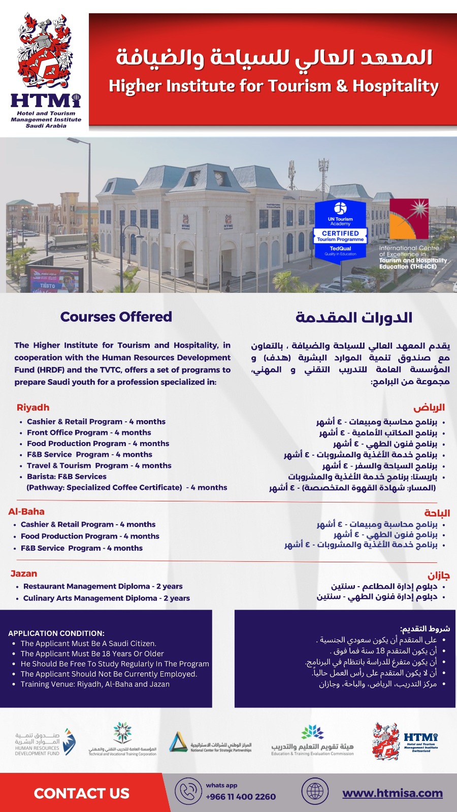 أعلن المعهد العالي للسياحة والضيافة (HTMi Saudi Arabia) بالتعاون مع صندوق تنمية الموارد البشرية (هدف) والمؤسسة العامة للتدريب التقني والمهني، مجموعة من البرامج لإعداد الشباب السعودي لمهنة متخصصة، وذلك وفقًا للتفاصيل الموضحة أدناه.
