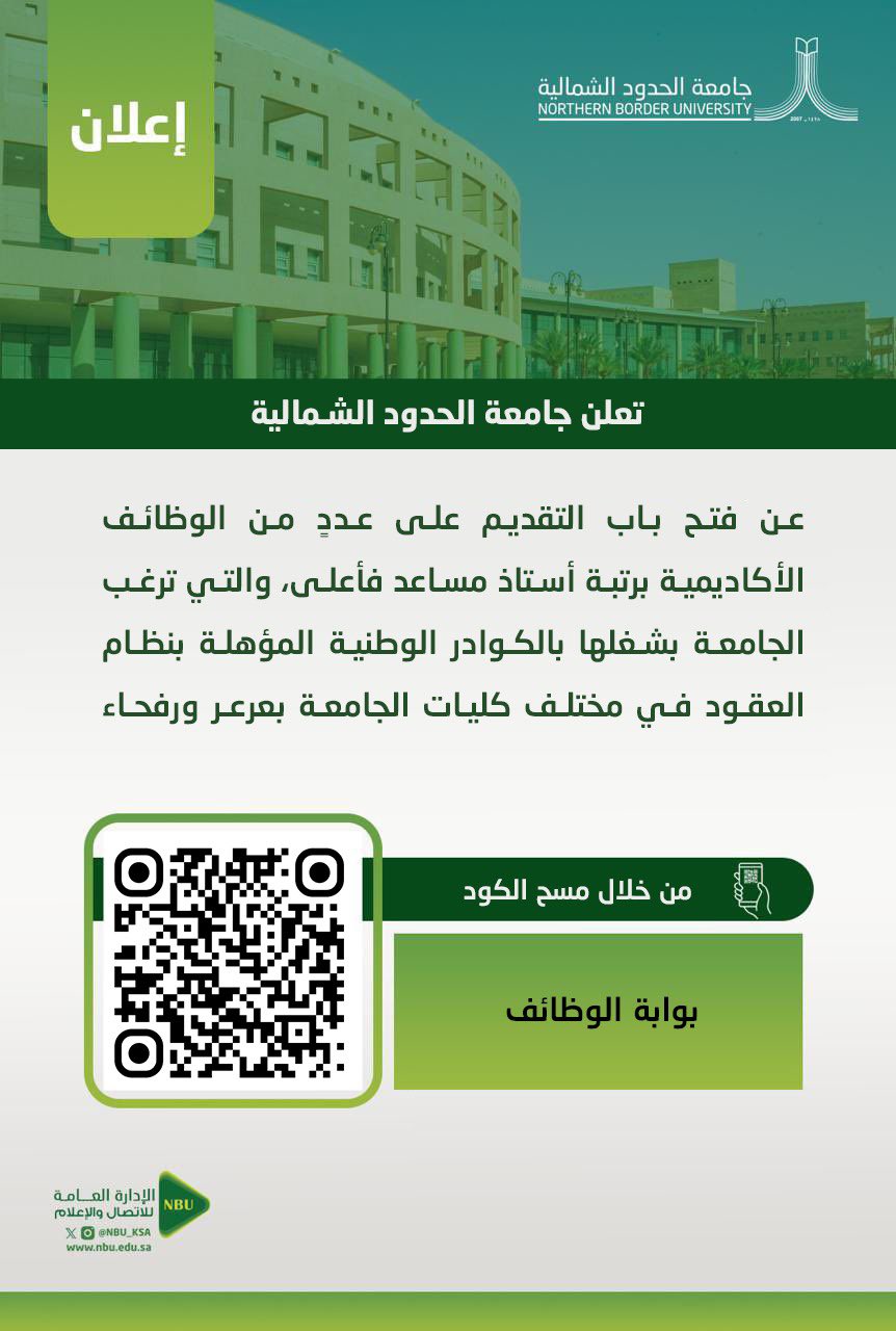 أعلنت جامعة الحدود الشمالية عن فتح باب التقديم على عددٍ من الوظائف الأكاديمية برتبة (أستاذ مساعد فأعلى)، والتي ترغب الجامعة بشغلها بالكوادر الوطنية المؤهلة بنظام العقود في مختلف كليات الجامعة بـ عرعر ورفحاء، وذلك وفقاً للتفاصيل وطريقة التقديم الموضحة أدناه.