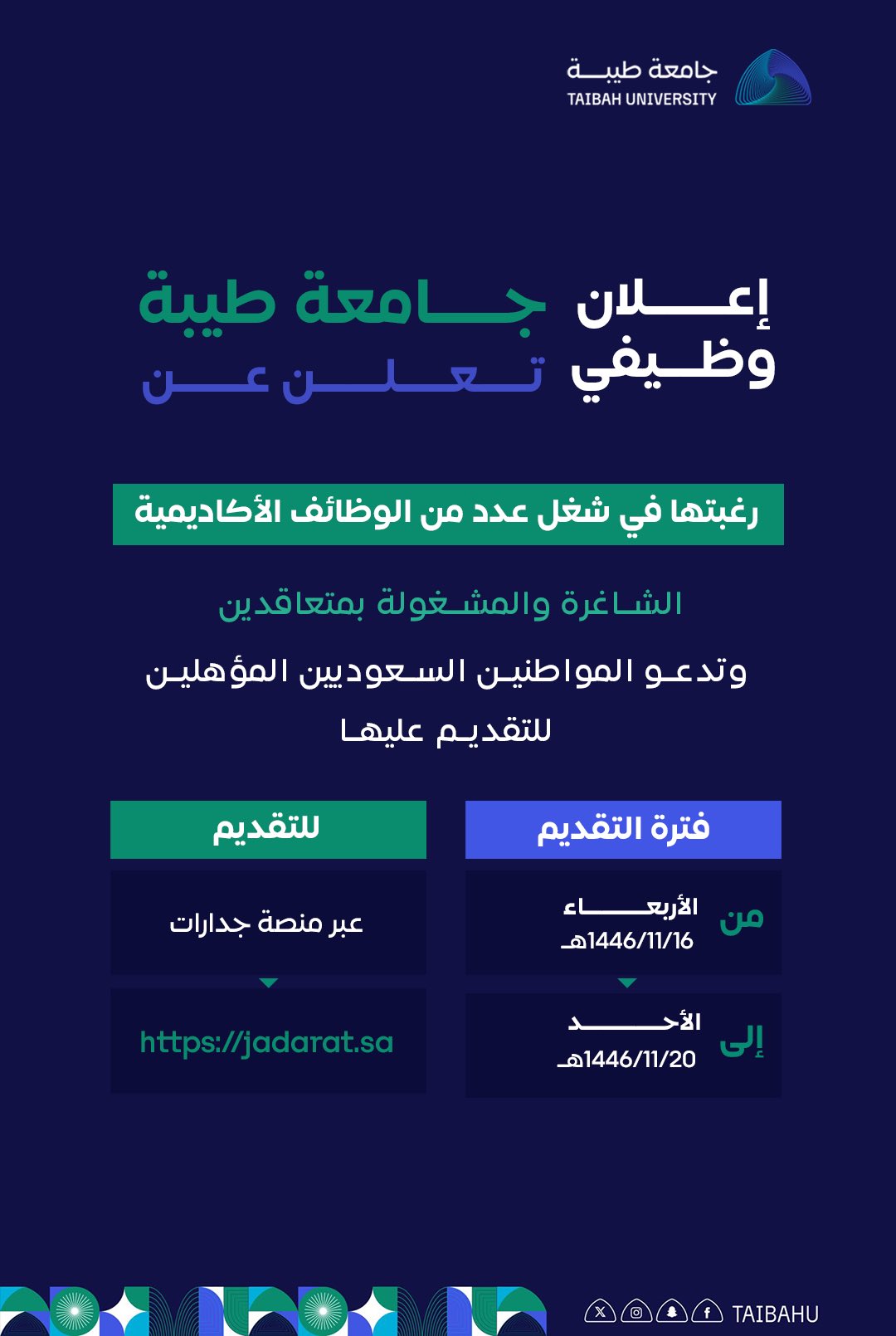 وظائف حكومية أكاديمية (للسعوديين) عبر (جدارات) لدى (جامعة طيبة)