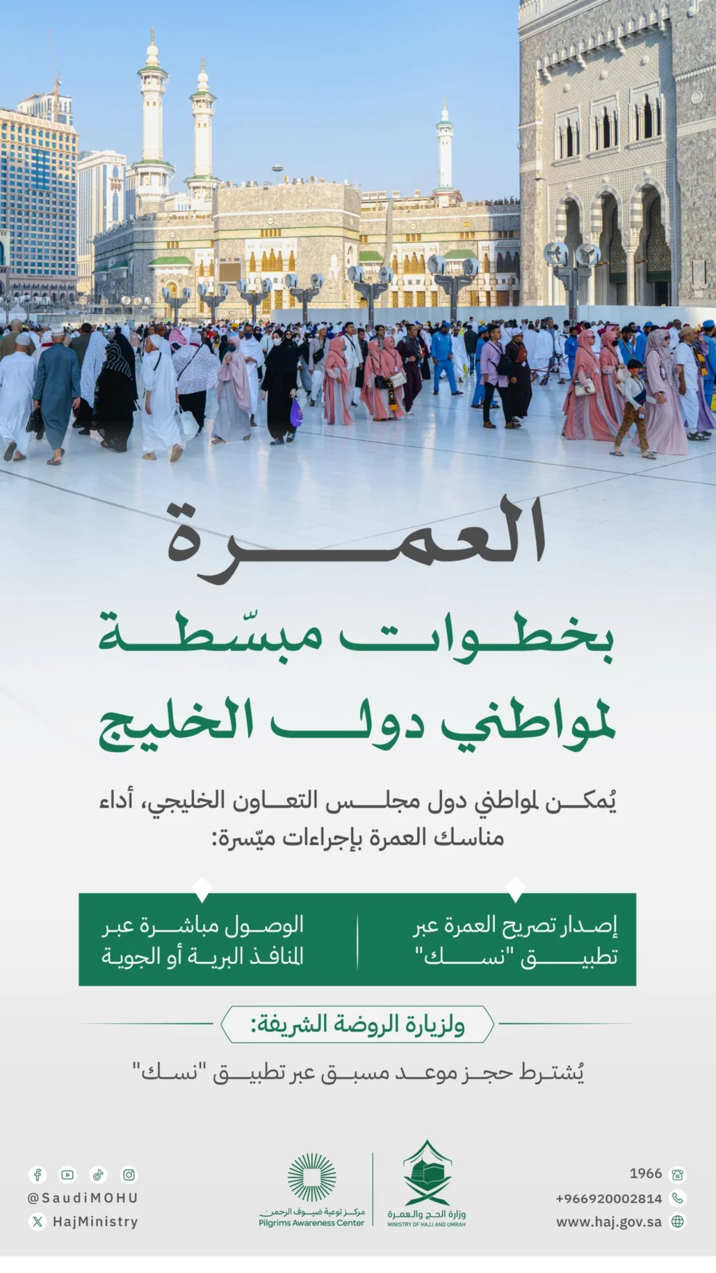 وأضافت أنه يمكن لمواطني دول مجلس التعاون الخليجي أداء مناسك العمرة بإجراءات ميسرة، من خلال إصدار تصريح العمرة عبر تطبيق “نسك” والوصول مباشرة عبر المنافذ البرية أو الجوية.