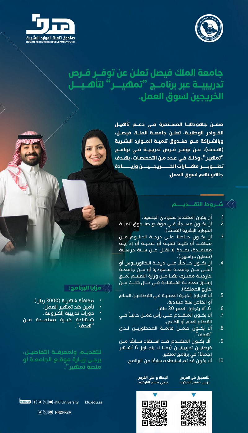 أعلنت جامعة الملك فيصل عن توفر فرص تدريبية (رجال / نساء) عبر برنامج “تمهير” لتأهيل الخريجين لسوق العمل، وذلك بالتعاون مع صندوق تنمية الموارد البشرية (هدف)، بهدف تطوير مهارات الكوادر الوطنية وزيادة جاهزيتهم المهنية، وذلك وفقاً للتفاصيل الموضحة أدناه.