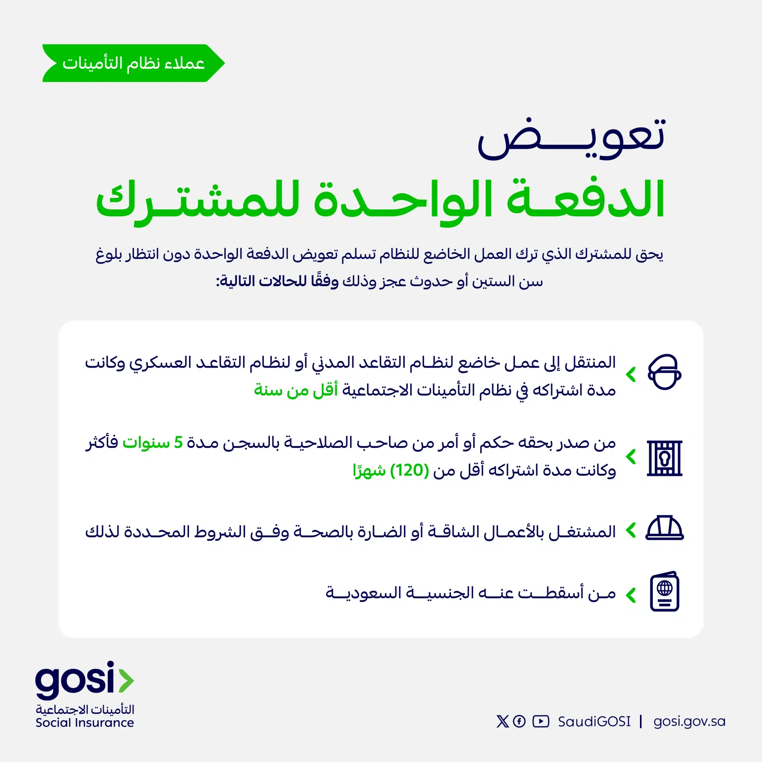 وتابعت عبر منصة إكس أنه بالنسبة إلى حالات صرف تعويض الدفعة الواحدة قبل بلوغ سن الستين فهي تكون كالتالي: